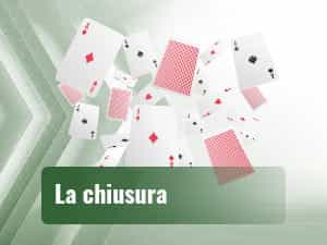 Per chiudere occorre aver calato tutte le carte in mano e aver scartato una carta. Apertura e chiusura possono essere contemporanei.