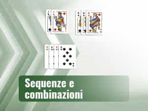 Le combinazioni possono essere di 3 o 4 carte uguali e seme diverso. Le sequenze sono scale da 3 a 13 carte, dello stesso seme.