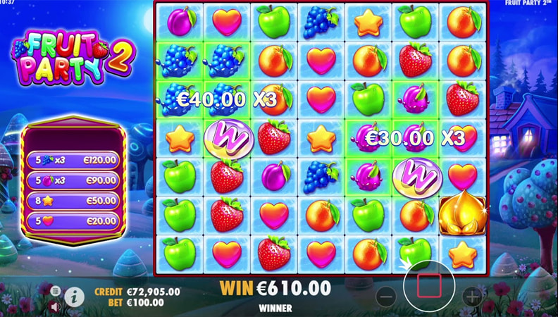 I simboli base di Fruit Party sono quasi tutti frutti colorati. Le fragole sono le più generose, mentre i cuori quelli con il valore più basso. Come accade in molte altre slot con meccanica a cluster disponibili nei casinò sicuri, le vincite dipendono dalla dimensione del gruppo di simboli uguali.
