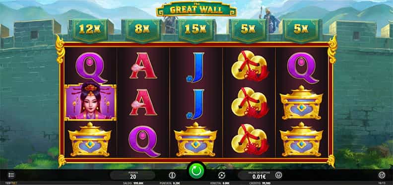 Anche lo stile dei simboli è curato nei minimi dettagli. La figura che ha un ruolo strategico all’interno del gameplay è impersonificata dall’imperatore. L’immagine che paga di più invece è quella della Regina, seguita dai tre guerrieri. Anche nella slot The Great Wall è presente un simbolo Wild che sostituisce tutte le altre icone eccetto quella dell’imperatore.